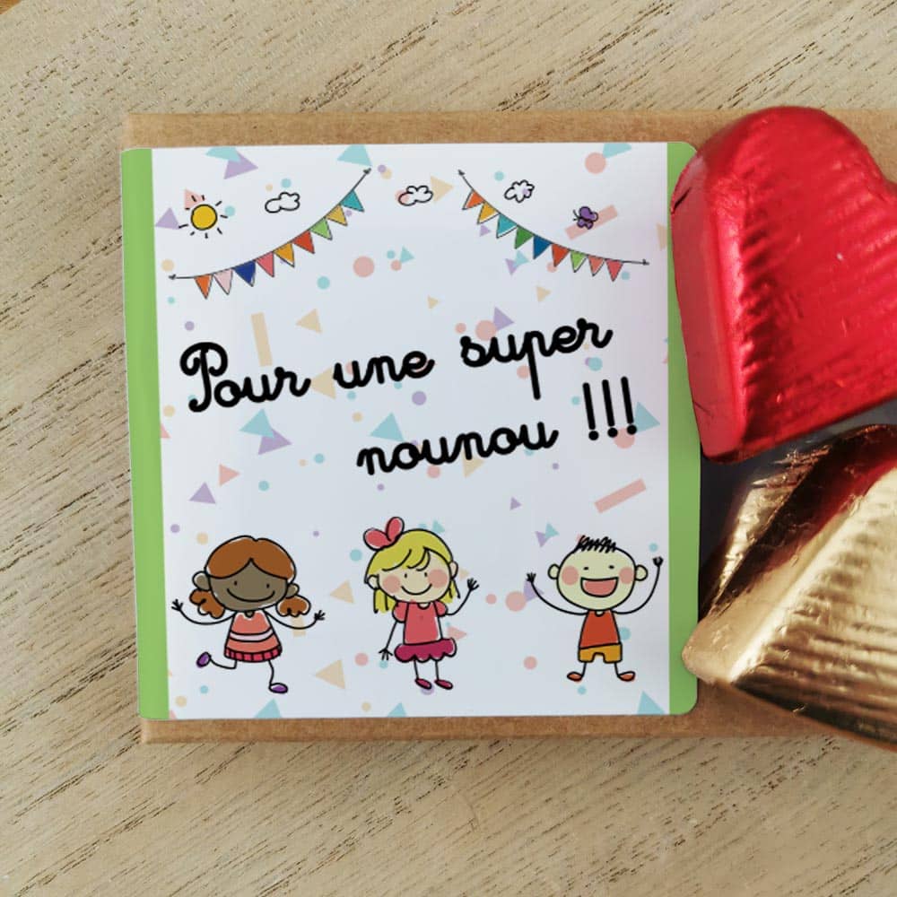 – Packaging : Boîte cartonnée avec fenêtre plastifiée et autocollant avec l’inscription “Pour une super nounou” aux couleurs multicolore