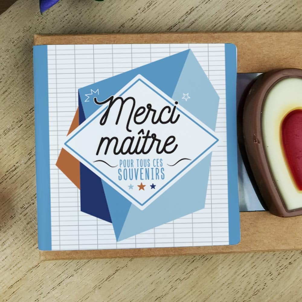 – Packaging : Boîte cartonnée avec fenêtre plastifiée et autocollant avec le texte Merci Maître aux couleurs bleues.