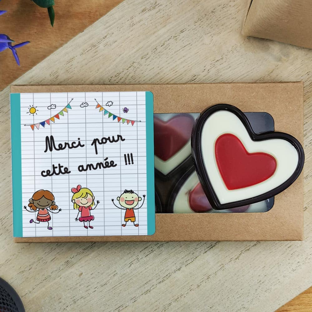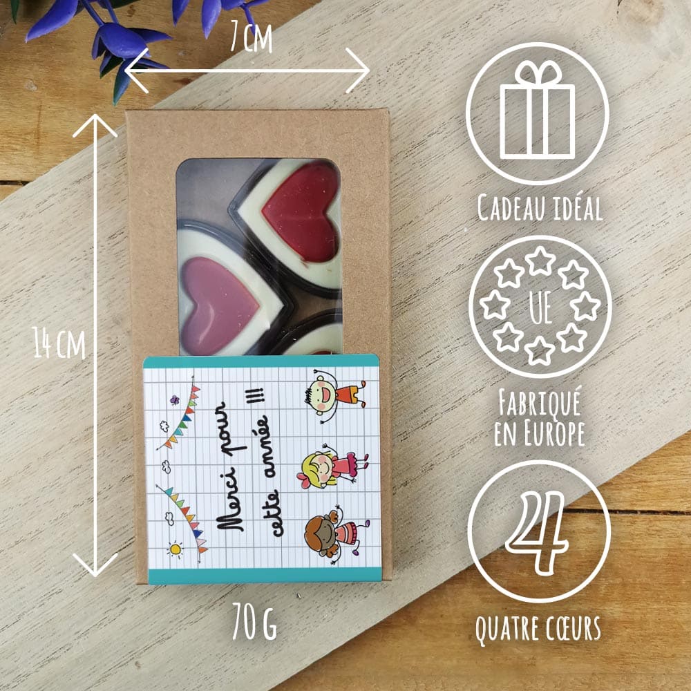 Offrez un cadeau original et gourmand à la maîtresse ou à votre nounou pour la fin de l’année scolaire avec ces chocolats noirs en forme de coeur. De quoi faire fondre la personne à qui vous voulez l’offrir !