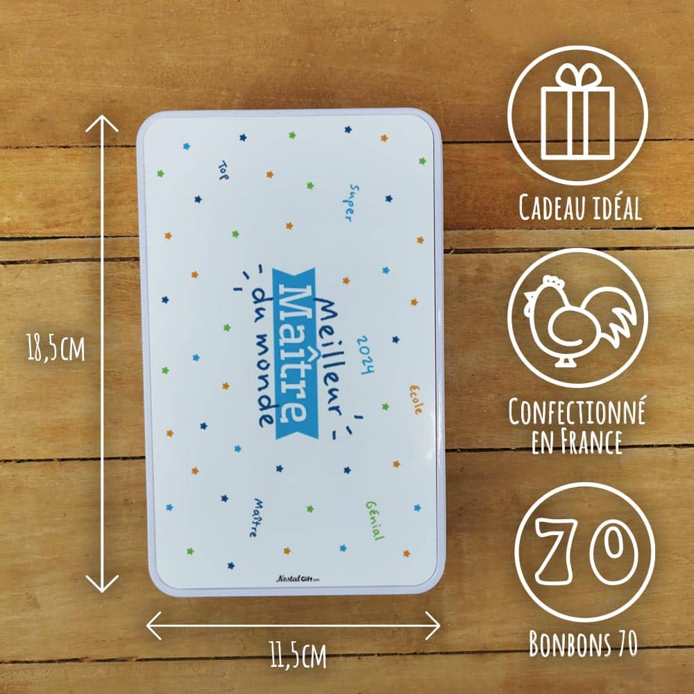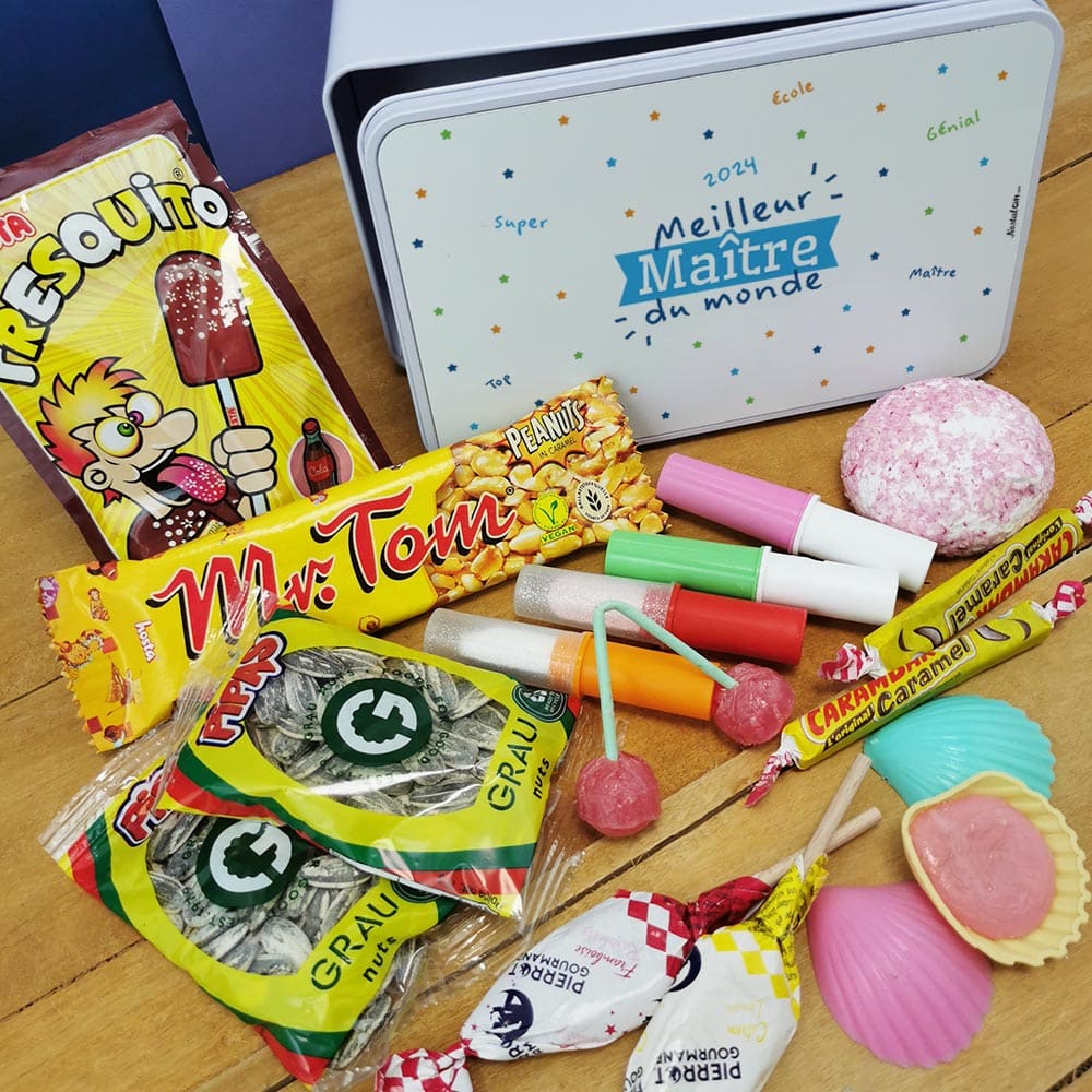 Offrez un cadeau original au Maître pour la fin d’année scolaire ! Ce coffret bonbon lui fera plaisir à coup sûr ! Faites lui redécouvrir les saveurs d’antan avec des bonbons des années 70 (Roudoudou, Fresquito, Boule coco, Graine de tournesol, Pierrot Gourmand…).Le tout livré dans une jolie boîte en métal imprimée spécialement pour le Maître. Retrouvez nos coffret bonbons.