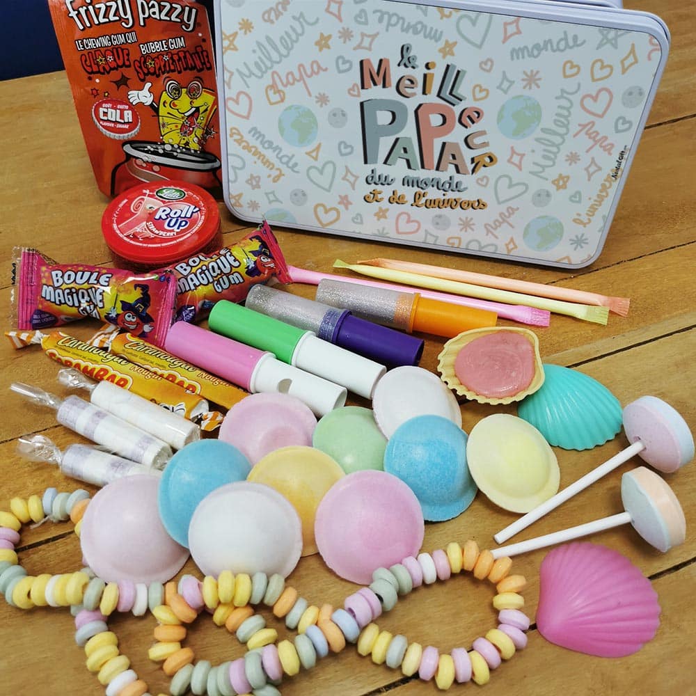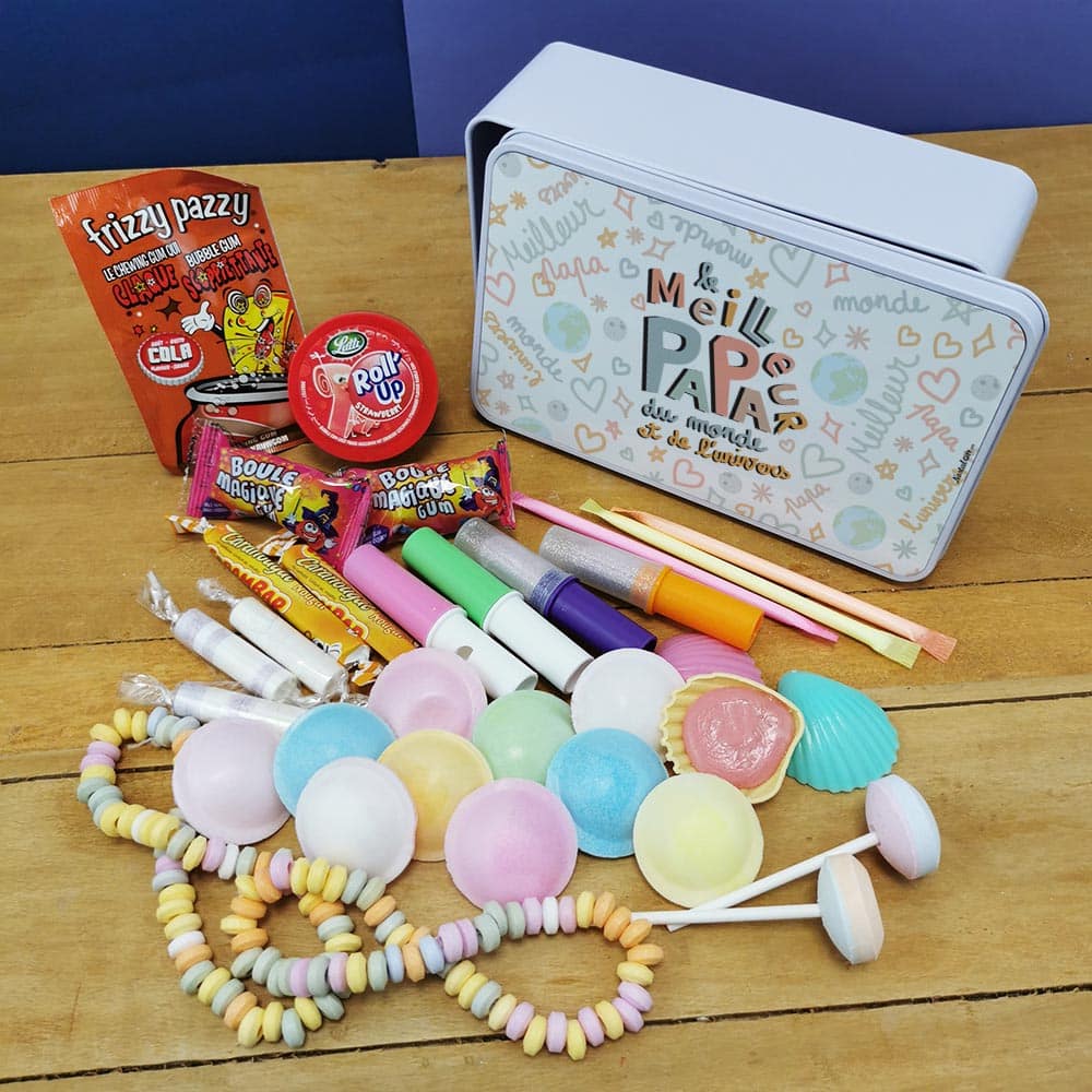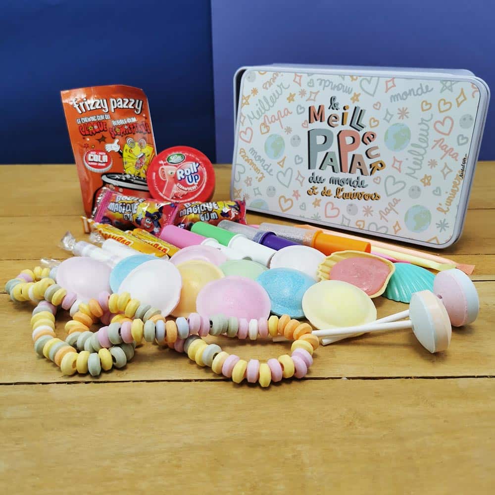 Offrez un cadeau original à votre papa ! Ce coffret bonbon lui fera plaisir à coup sûr ! Faites-lui redécouvrir les saveurs d’antan avec des bonbons des années 80 (Roudoudou, Roll’up, soucoupe, collier, Frizzy pazzy…). Le tout livré dans une jolie boîte en métal imprimée dans nos locaux. Retrouvez nos coffret bonbons.