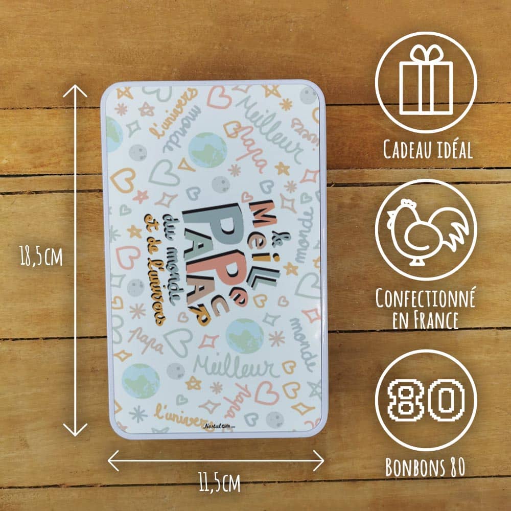 Bonbons des années 80 “Le meilleur Papa du monde et de l’univers” (Boîte en métal)Un cadeau parfait pour la fête des pères ou Noël où vous pourrez retrouver les saveurs d’antan avec les confiseries et vous replonger dans vos souvenirs grâce au design rétro de la boîte. Elle est réutilisable, et parfaite pour stocker les petits souvenirs.
