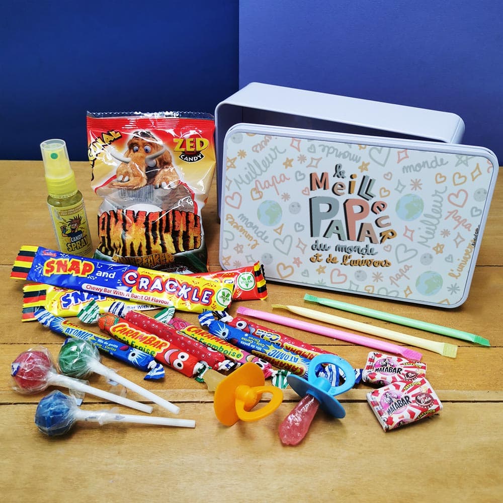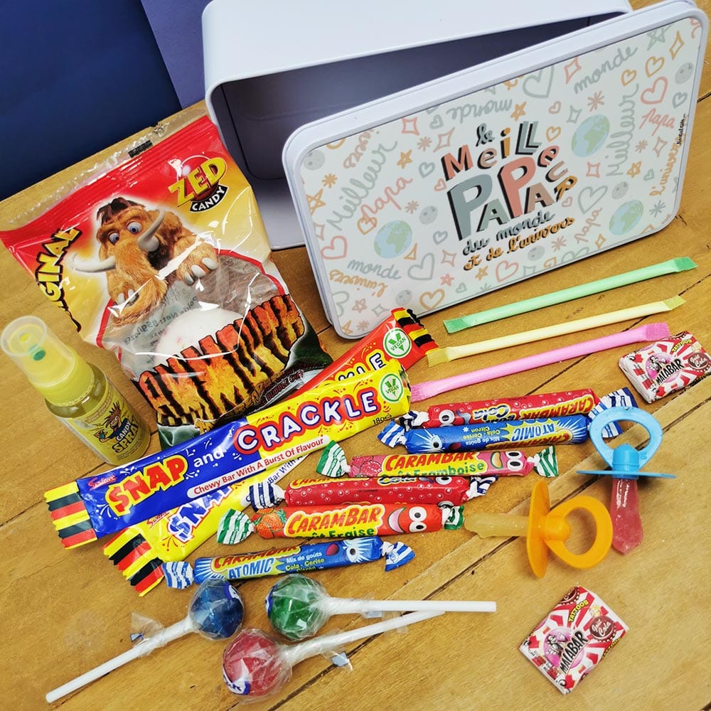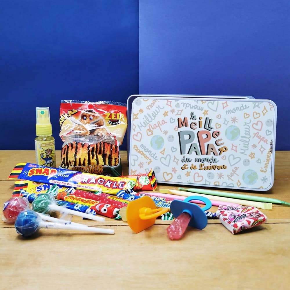 Offrez un cadeau original à votre papa ! Ce coffret bonbon lui fera plaisir à coup sûr ! Faites-lui redécouvrir les saveurs d’antan avec des bonbons des années 90 (Couille de mammouth, Carambar, Candy Spray…). Le tout livré dans une jolie boîte en métal imprimée dans nos locaux. Retrouvez nos coffret bonbons.