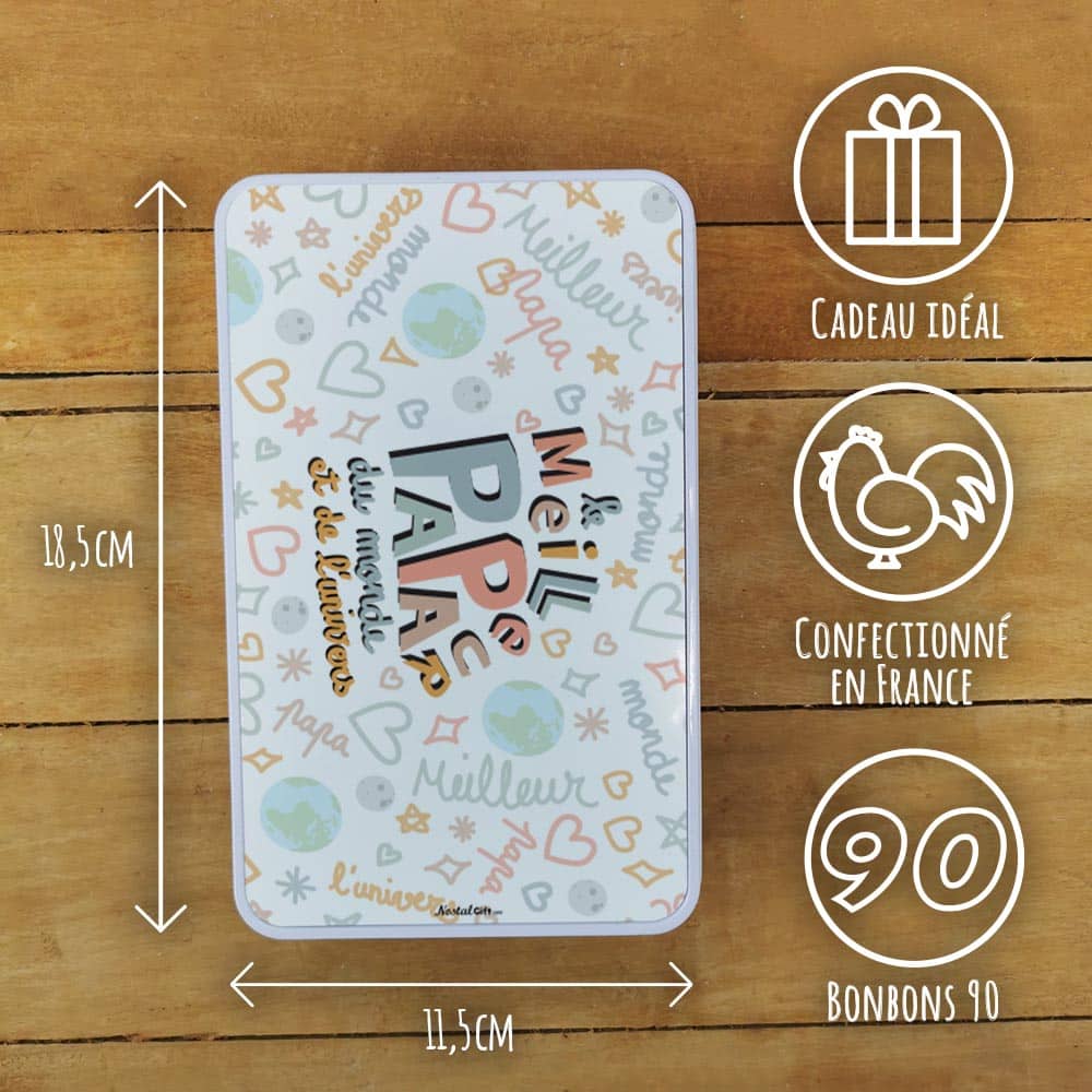 Un cadeau parfait pour la fête des pères ou Noël où vous pourrez retrouver les saveurs d’antan avec les confiseries et vous replonger dans vos souvenirs grâce à la jolie attention écrite sur la boîte. Elle est réutilisable, et parfaite pour stocker les petits souvenirs.