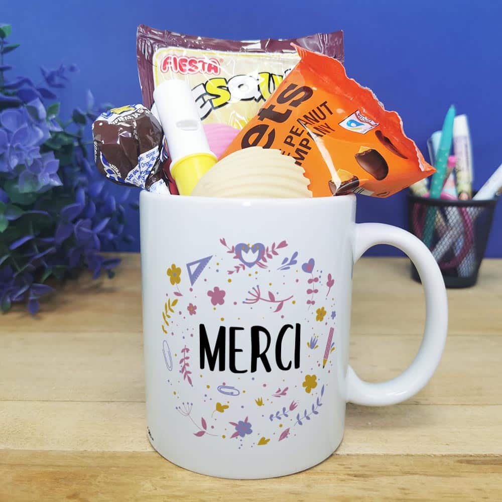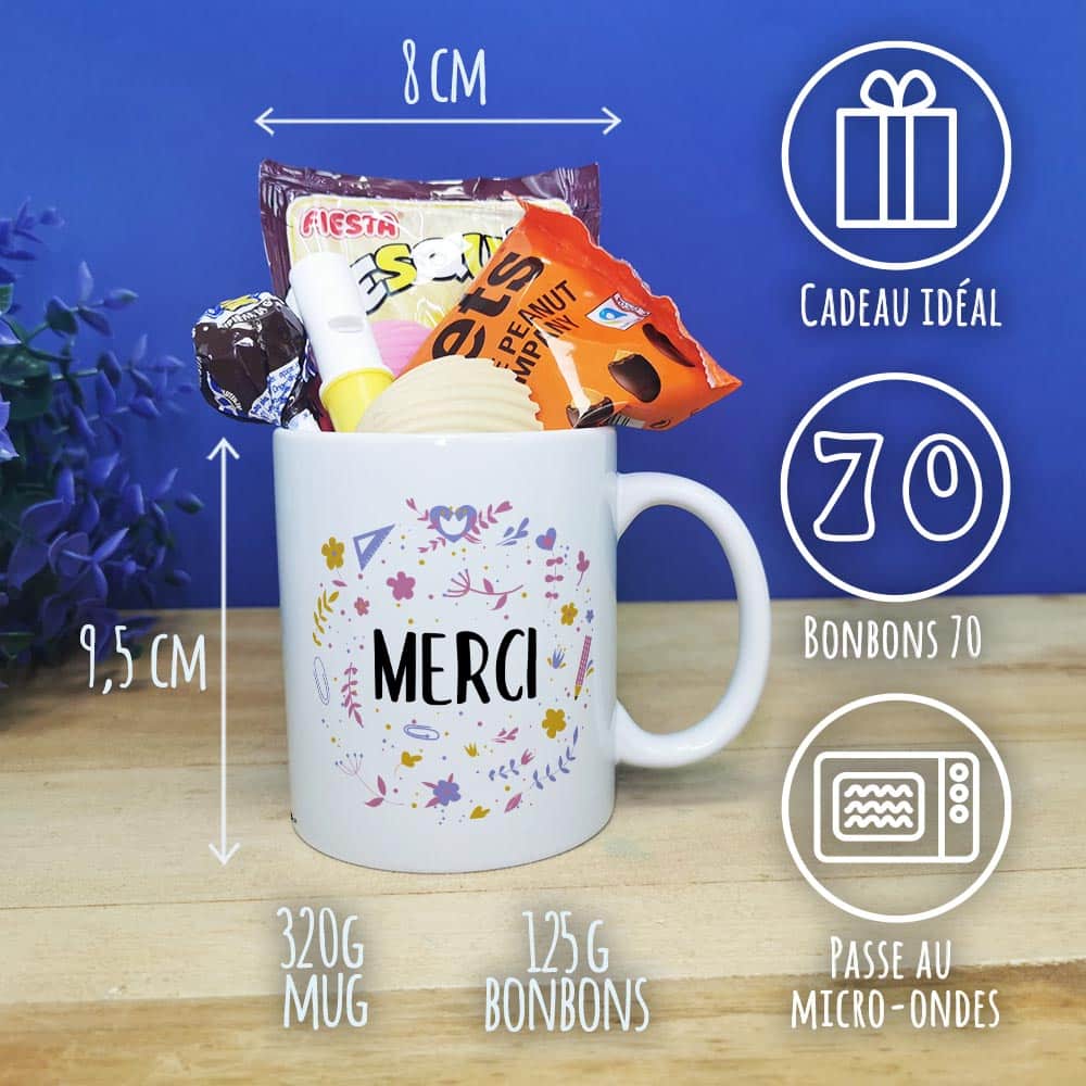 Offrez un cadeau original et pratique pour la fin de l’année scolaire de la maîtresse ou de votre nounou avec notre tasse, arborant des confiseries des années 70 avec l’inscription «Merci».