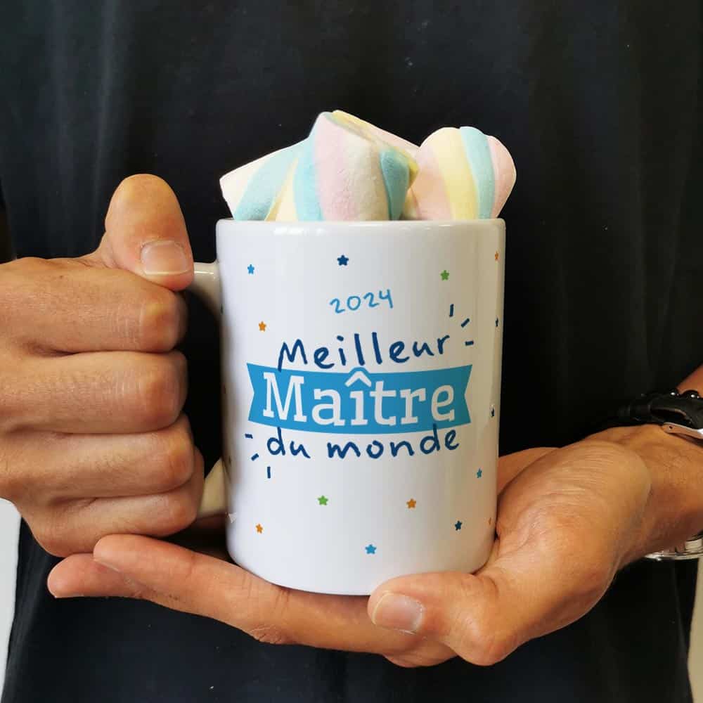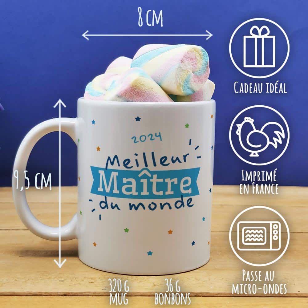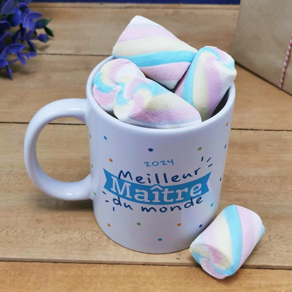 Inscrivez-vous pour avoir accès aux prix revendeursOffrez un mug gourmand personnalisable au Maître avec ce magnifique mug «Meilleur maître du monde» rempli de 5 grosses guimauves en forme de torsade.