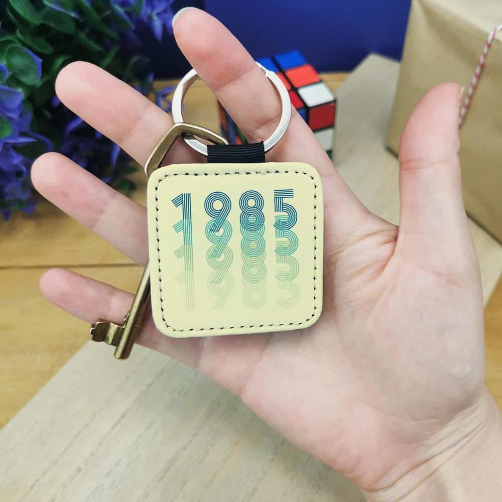 Voici une idée de cadeau : Le design de ce porte-clé en similicuir est parfait ! Avec ses dimensions de 5 x 5 cm et son poids léger de 12 gr, ce porte-clé est facilement transportable, il est parfait pour vos clés de maison ou de voiture. Son motif «1985» en bleu et beige est idéal pour la personne à qui vous l’offrez. La couleur noire à l’arrière assure une finition élégante. L’impression est réalisée dans notre atelier en France, pour un résultat de qualité. Le porte-clé est également équipé d’un anneau en métal pour attacher facilement aux clés.