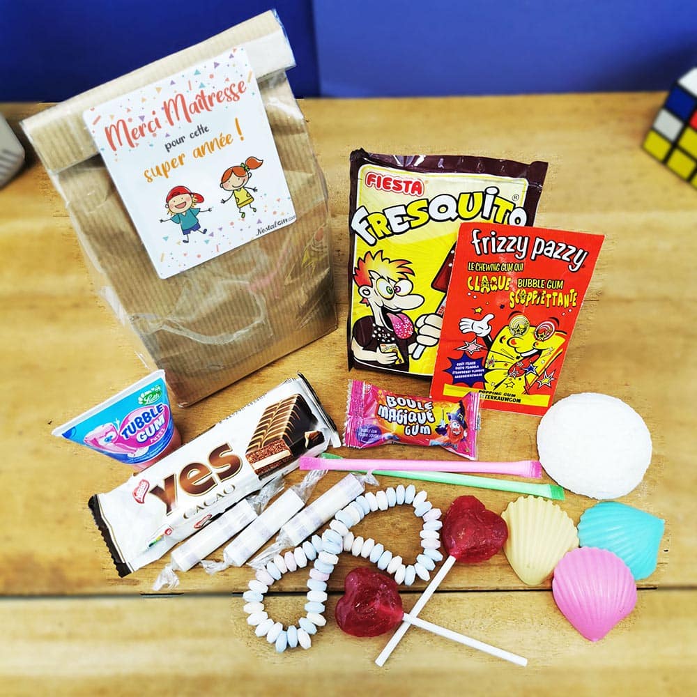 Offrez ce sachet de bonbons 80 à la maîtresse. Faites-la retomber en enfance avec le goût et l’odeur de ces confiseries (Fresquito, Frizzy Pazzy, Gâteau YES cacao , Tubble gum tutti, Collier bonbon dextrose, Sucettes en forme de coeur à la cerise, Pailles poudre acidulée , Fizzy Roll , Roudoudou , Sachet de 2 boules magiques, boule coco) ! N’attendez pas et montrez à quel point la maîtresse est important pour vous.