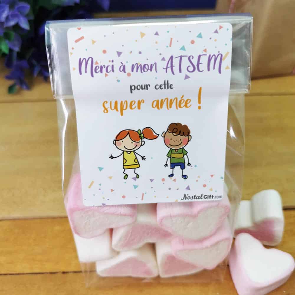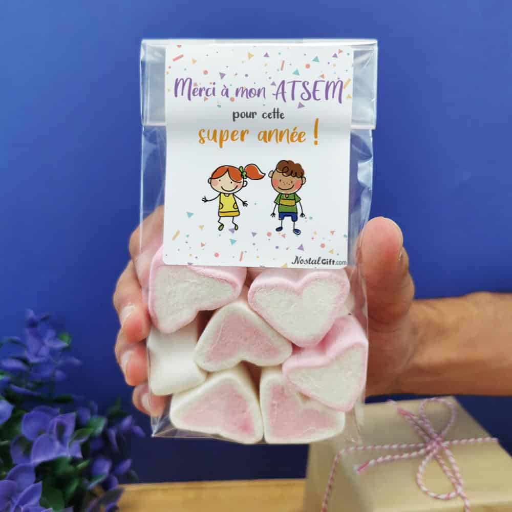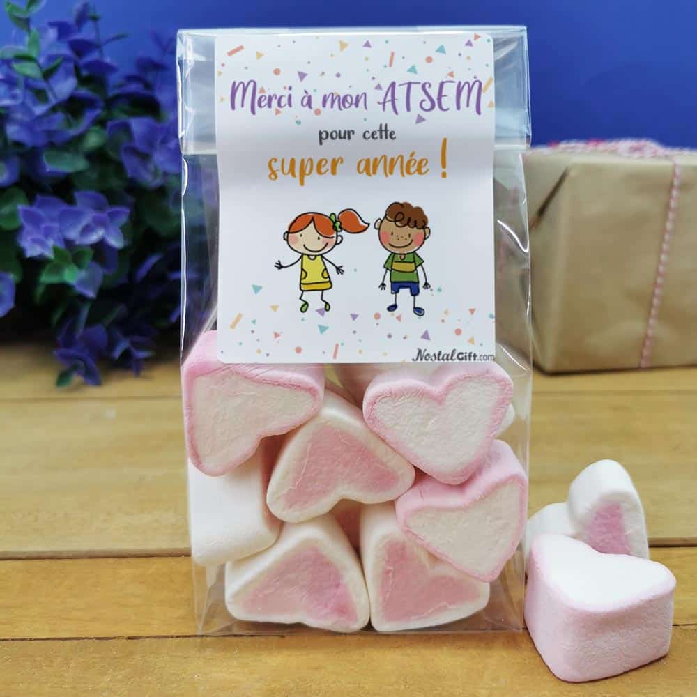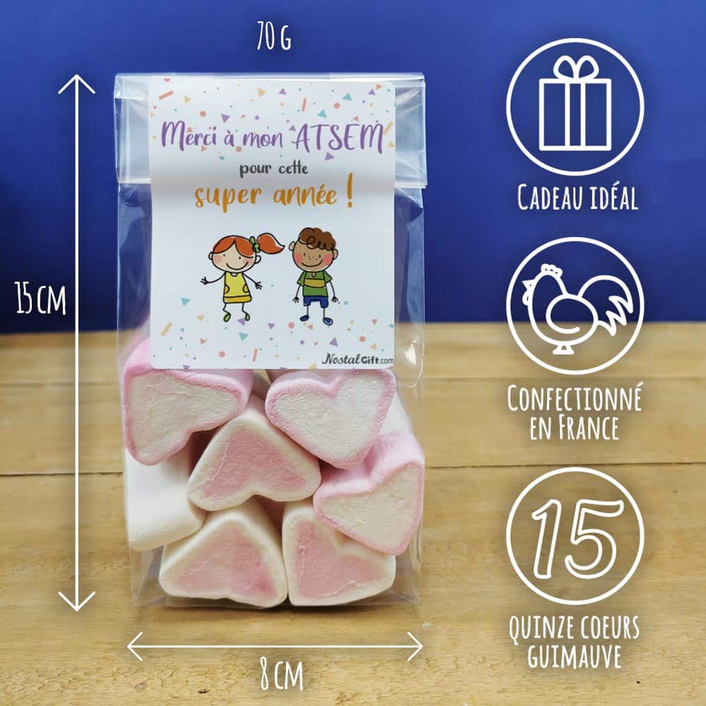Sachet gros coeurs en guimauve x 15 – “Pour une super Atsem” – Dessin d’enfants