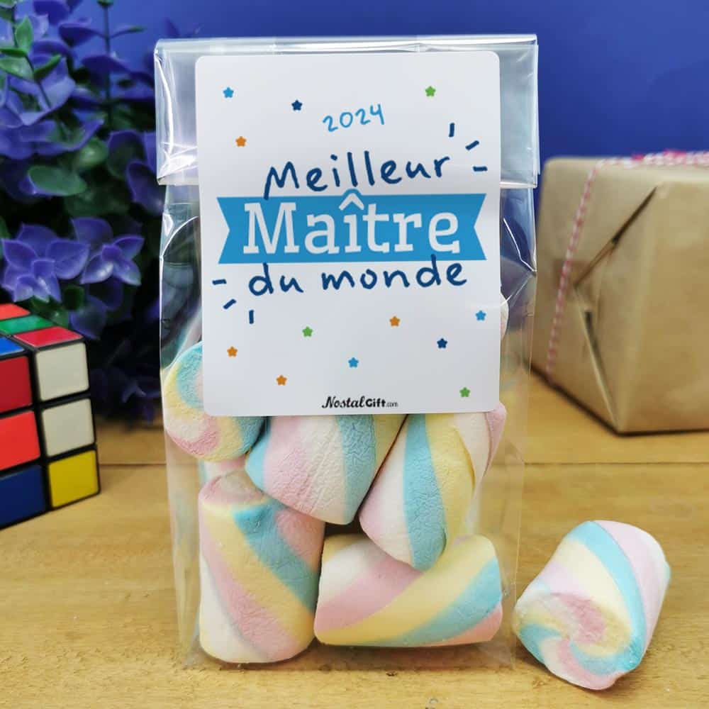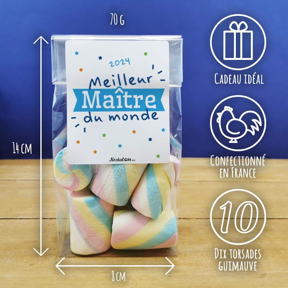 Offrez ces grosses guimauves torsades au Maître de votre enfant, pour la fin de l’année scolaire ou pour un départ à la retraite. Il sera ravis de déguster ces petites sucreries. A savourer sans modérations pour les grandes comme les petites faims.